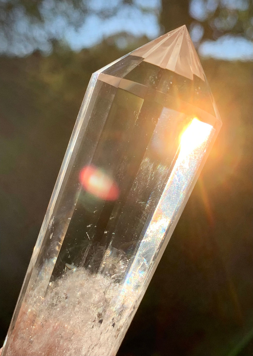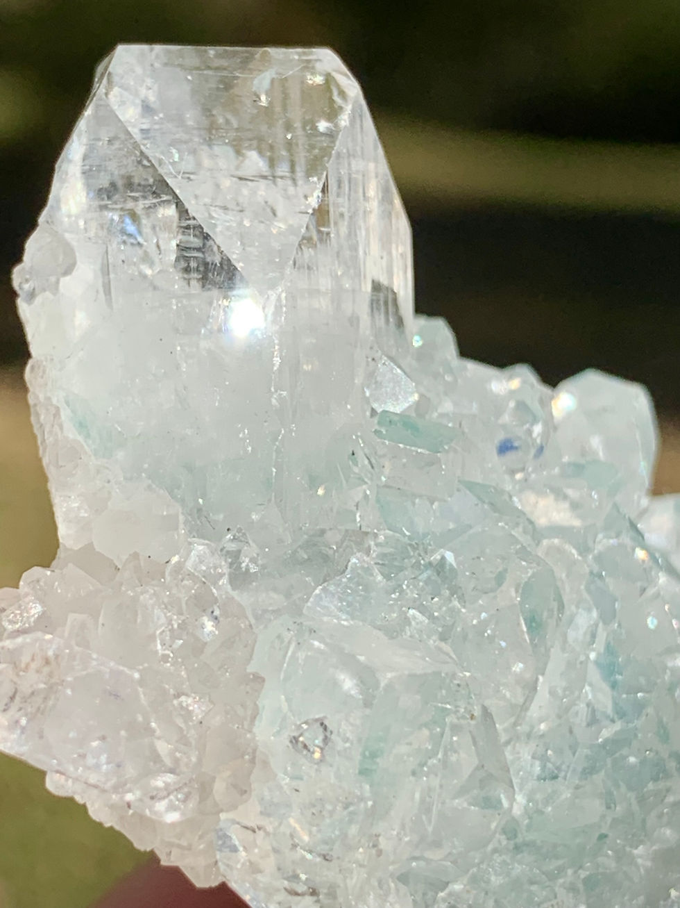 Sourced from Jamner in the Jalgaon District of India, this collection of Apophyllite Wands features a blend of AAA-grade, glass-clear crystal and varying degrees of soft blue chalcedony. Each specimen displays remarkable shimmer in direct sunlight, often revealing subtle rainbows with movement. This piece in particular showcases a beautiful light blue chalcedony with sugary Apophylite crystals throughout